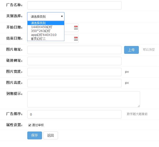 找到【擴展】,選擇【廣告管理】,點擊【添加圖片廣告】。首先填寫【廣告名稱】,其次選擇好【類別選擇】,之后上傳【圖片地址】,填寫好【鏈接網址】,定義好【圖片寬度】、【圖片高度】,最后點【保存】就可以
