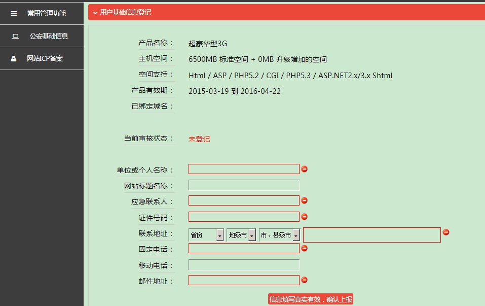 國外空間,域名不需要備案,直接在“網站域名綁定”中綁定對應域名即可。如果是國內空間,域名先要備案成功后才能綁定使用,如果網站沒有填寫公安基礎信息,綁定時會有提示,要求先填寫相應的信息,如下圖: